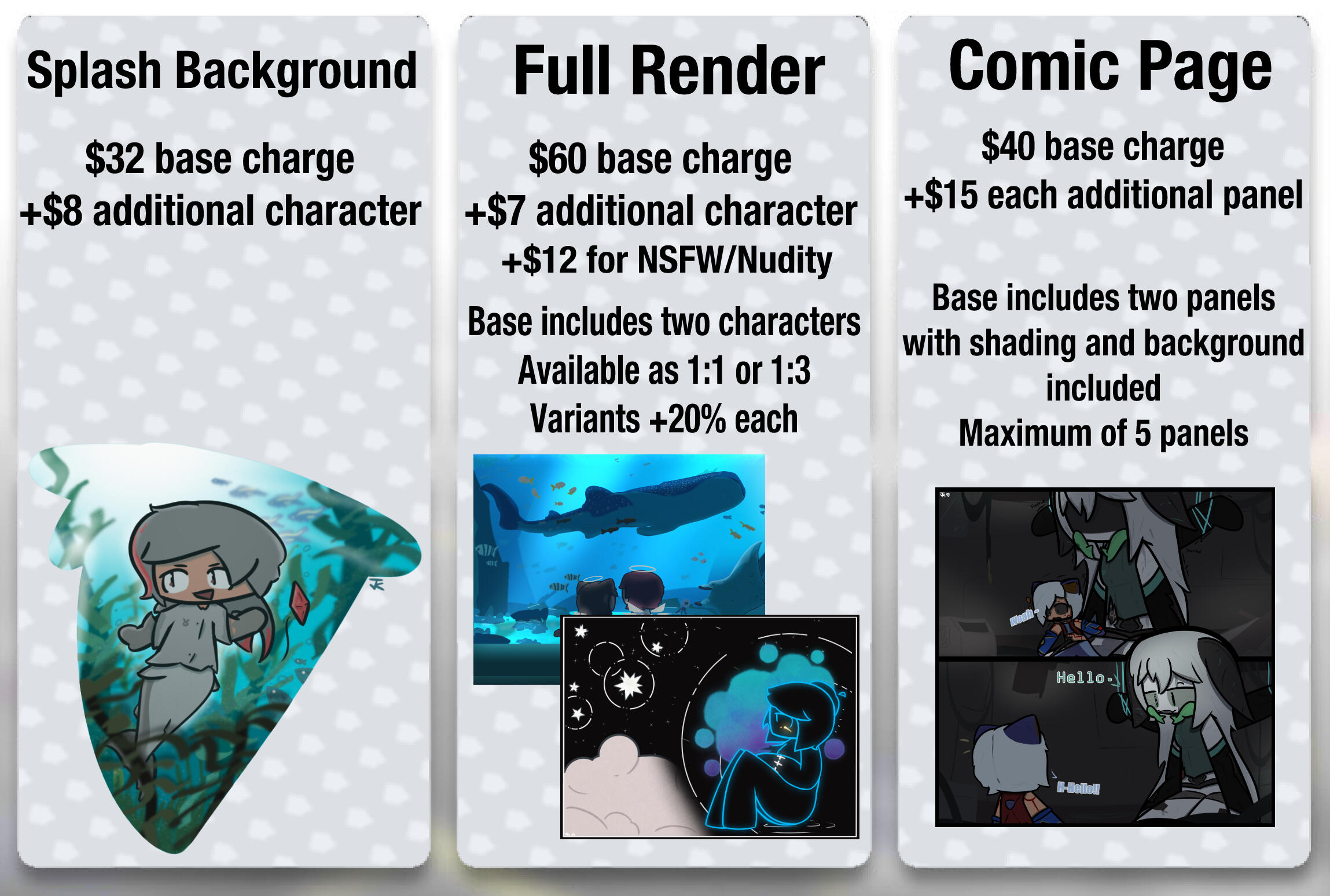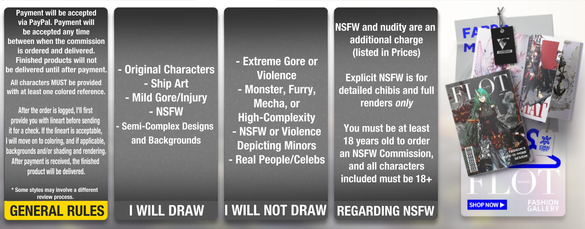As mentioned in the Art Policy tab, payment will be accepted through PayPal. Payment is expected to be delivered any time before the finished product is delivered.While commissions are closed, you may reserve a slot for when they reopen, but doing so will add a +$3 fee to your order.I reserve the right to deny or cancel your commission for any reason. If the commission was not completed, you will receive a refund.